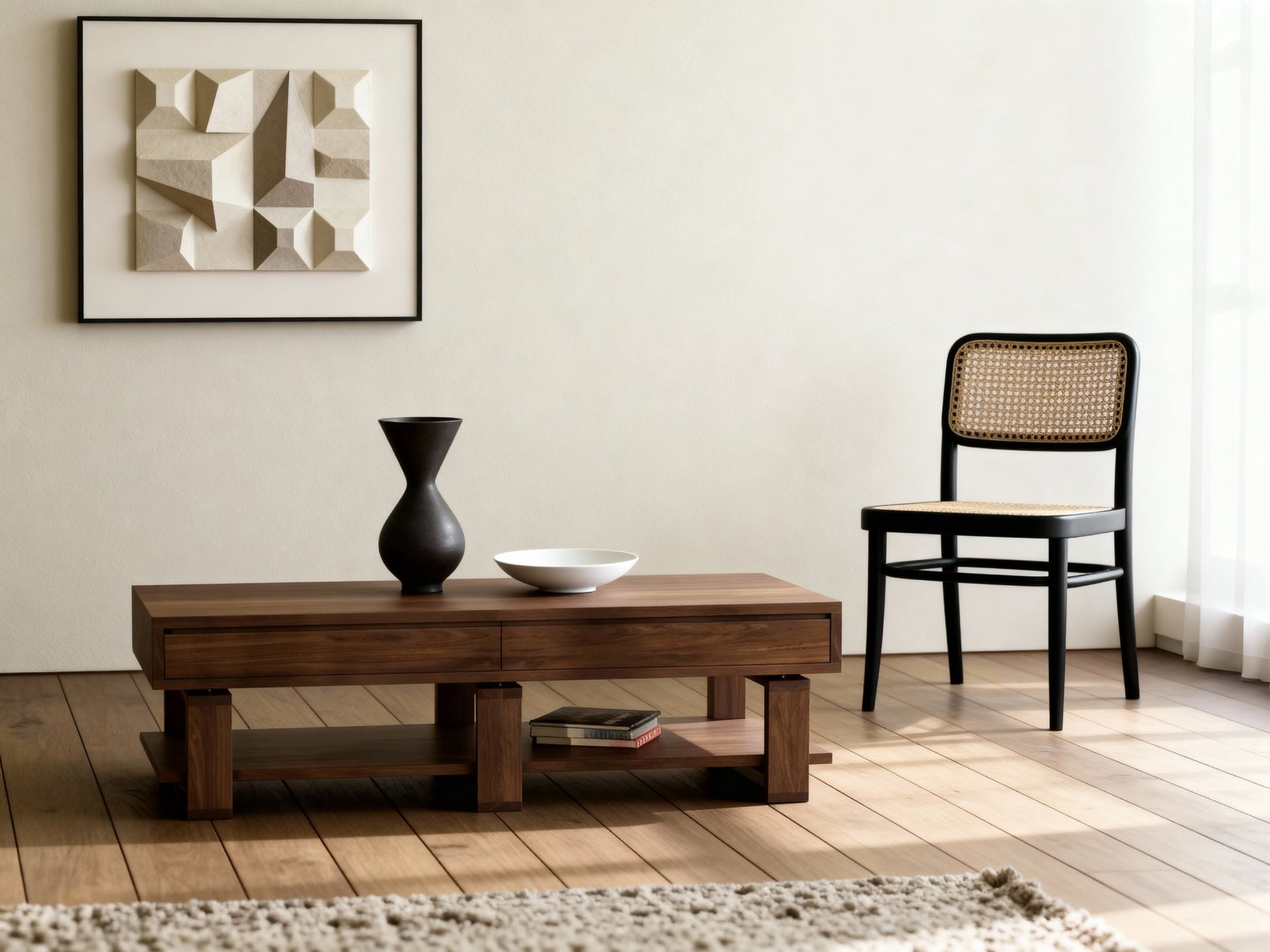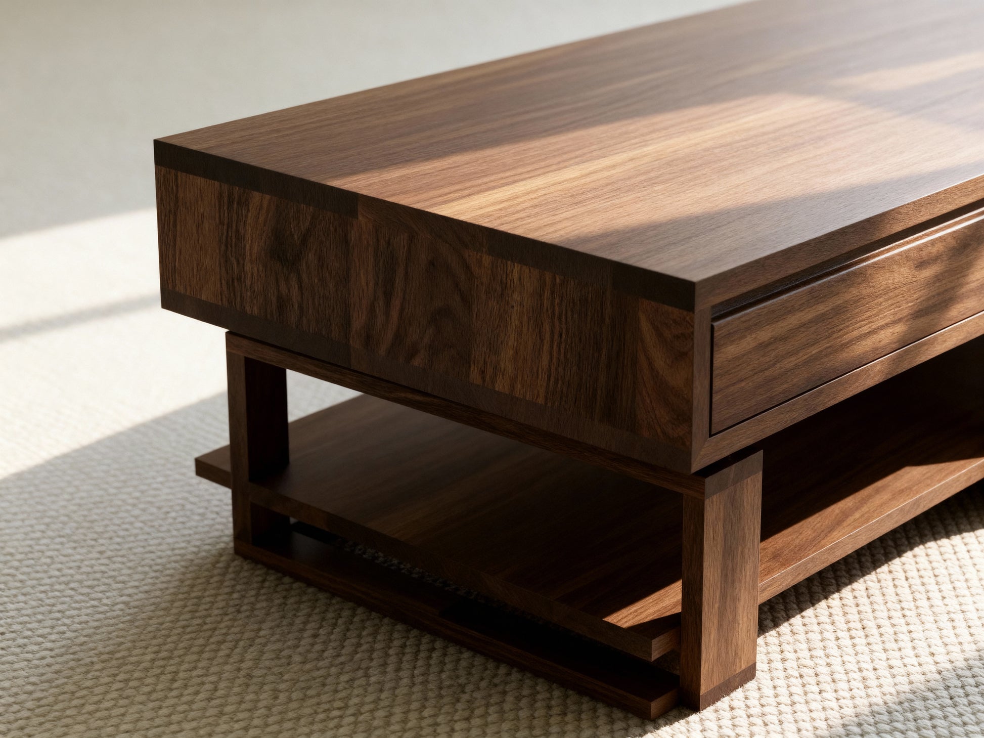 Bodhi Black Walnut Coffee Table – Solid Wood with 4 Drawers & Storage Shelf