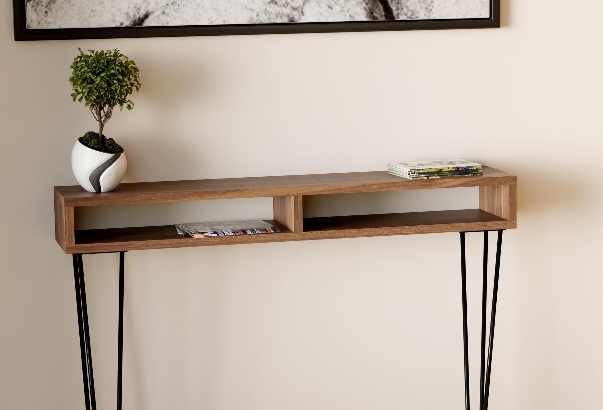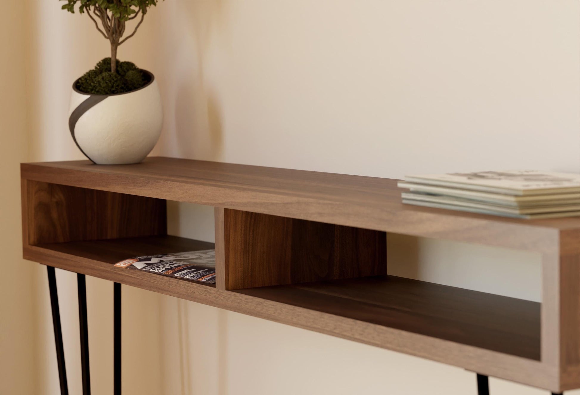 Bring warmth and style to your home with our handcrafted narrow console table. Thoughtfully designed with a minimalist yet inviting aesthetic, this piece combines the natural beauty of sustainably sourced Solid Walnut wood with the sleek look of metal hairpin legs. It’s the perfect fit for modern, rustic, or mid-century-inspired spaces.